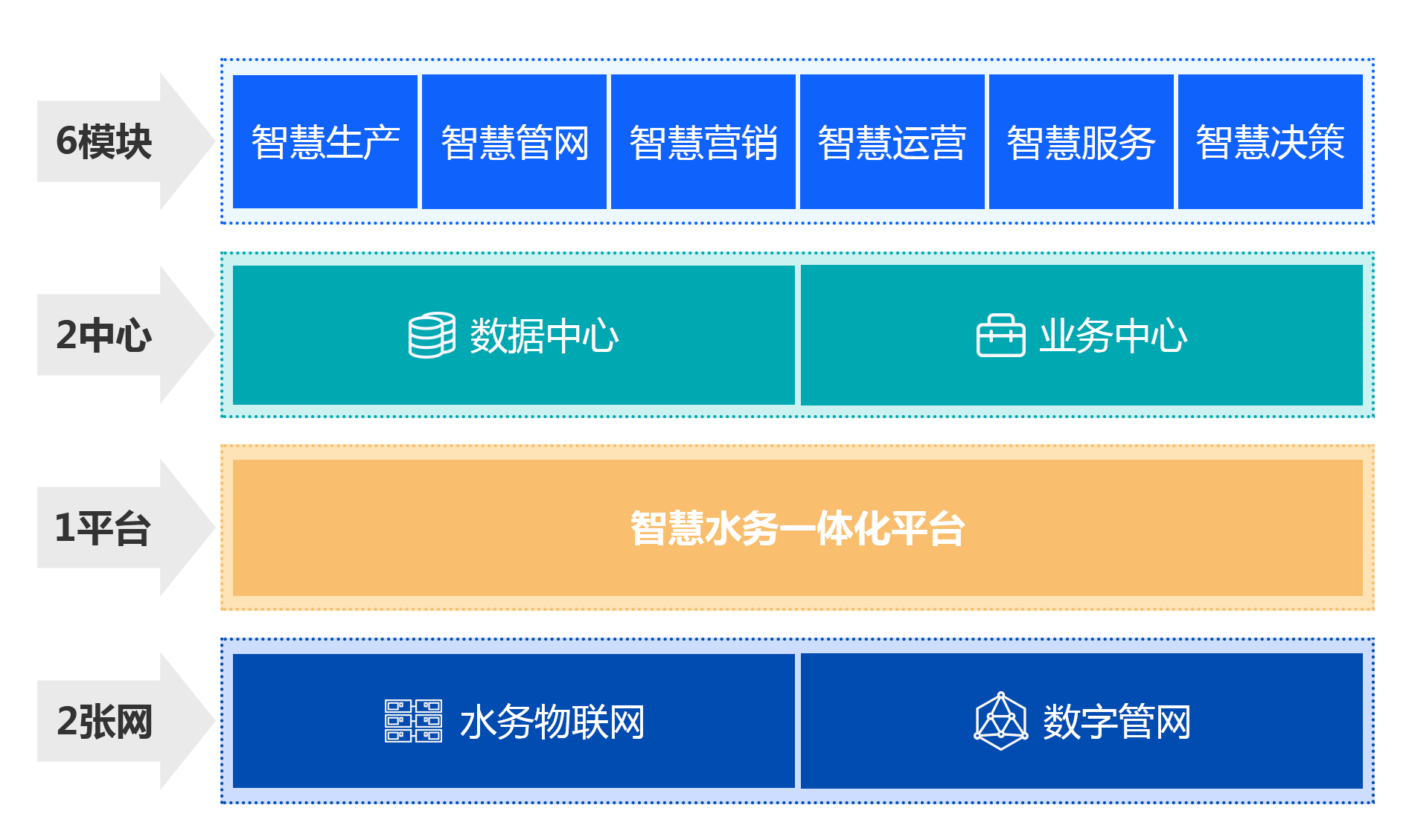 智慧水务顶层设计:构建“二张网、一个平台、二个中心、六大业务模块”。