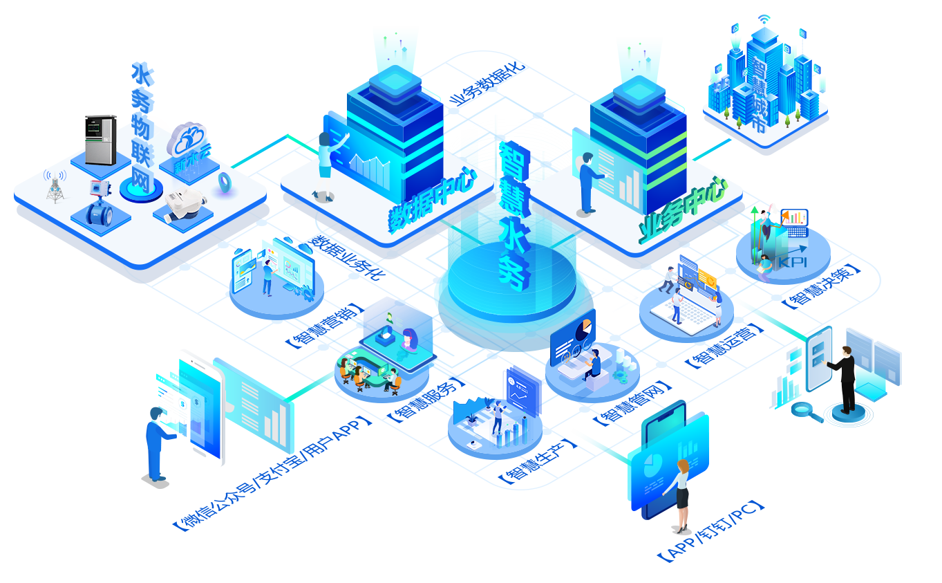 水务业务模块是在智慧水务平台业务应用部分,实现了对水务全流程业务的管理;包含:智慧生产、智慧管网、智慧营销、智慧运营、智慧服务和智慧决策6大板块;每个板块包括若干业务子系统模块。