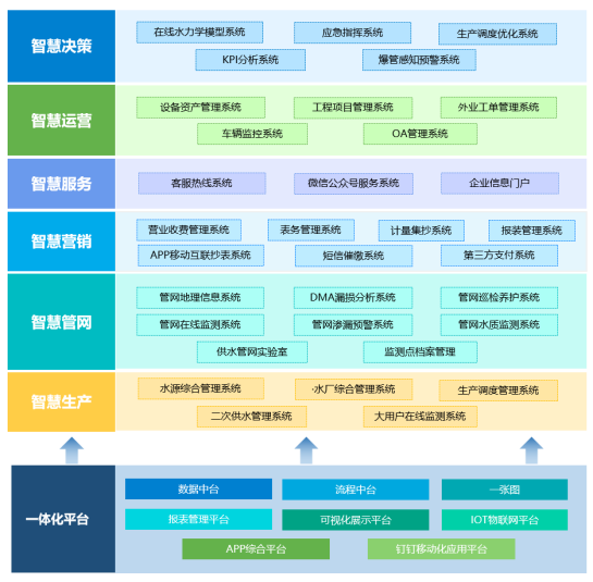 业务应用层:即顶层设计中的“六大业务综合应用平台”,它集成基础应用层中各应用系统的数据及流程,并重新规划、整合,涵盖智慧水务的业务汇集、协同和管理的支撑体系,集成和优化多个业务部门的互相协同,实现跨越多个部门的业务处理;它包含智慧生产、智慧管网、智慧营销、智慧运营、智慧服务、智慧决策等六大应用模块,以系统集成技术支撑重点应用平台的建设,从而使各业务系统协同运行,保证基础数据畅通无阻、业务流程无障碍流转,有效提升业务系统的运行效率、打破企业信息孤岛。