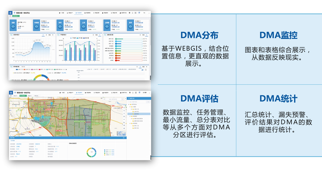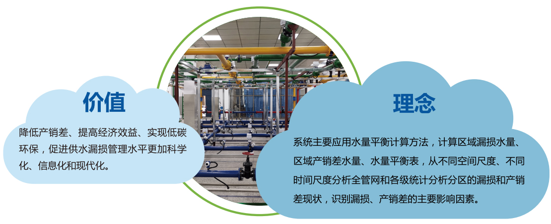 系统根据国际水协(IWA)管网漏损控制策略和DMA管理方法进行研发,为国内供水量身定制的漏损数据分析 与决策支持软件。系统基于管网GIS、大数据分析,主要应用各种漏损计算方法,对计量分区和DMA进行管理。 计算区域漏损水量、区域产销差水量、水量平衡表,从不同空间尺度、不同时间尺度分析全管网和各级统计分析分 区的漏损和产销差现状,识别漏损、产销差的主要影响因素。