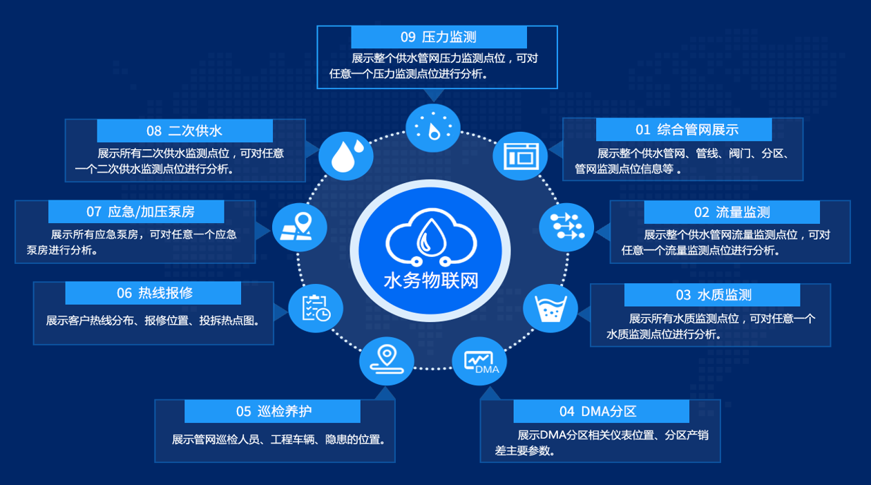 管网在线监测系统把供水各业务环节的设备(水厂设备、二供设备、水源设备、管网设备)的运行参数,生产数据进行采集和统计分析,以此保障供水安全。