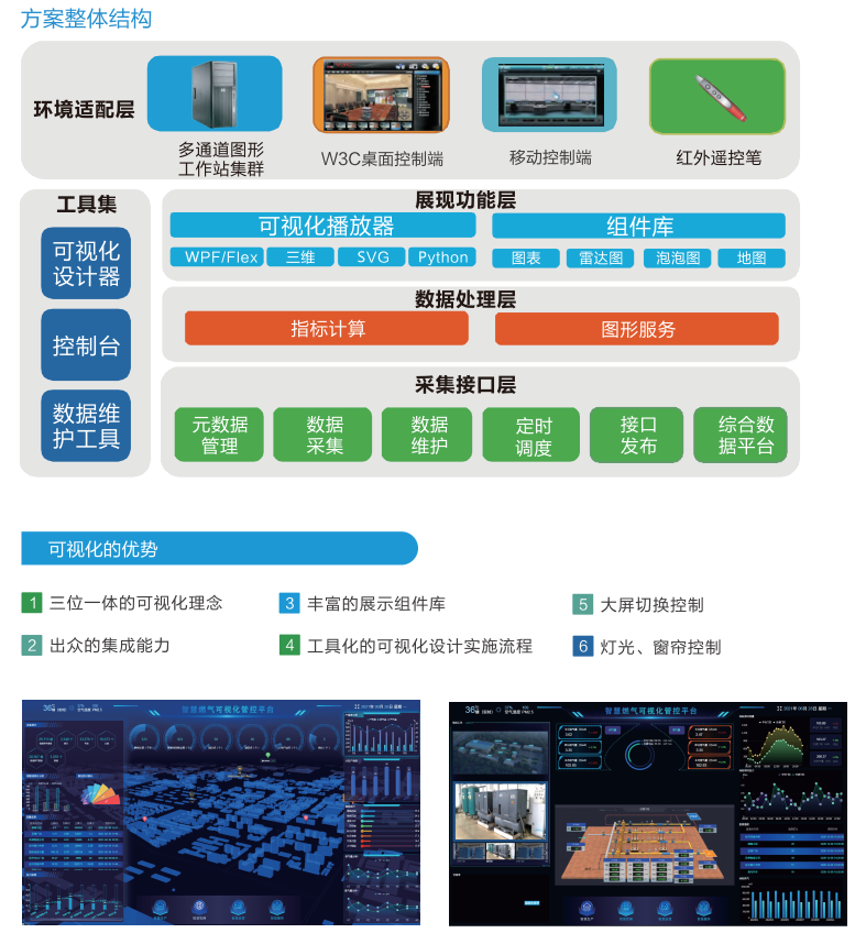 为燃气调度中心提供一体化的可视化大屏展现解决方案。实现可视化的过程主要有三步,首先是数据采集、分析、治理、管理和数据挖掘在内的一系列复杂处理过程;然后由设计师设计成立体、多维、动态、实时且可以交互的表现形式,最后利用建模方法,处理大规模数据的体系架构、交互技术、放大缩小等方法做出呈现。